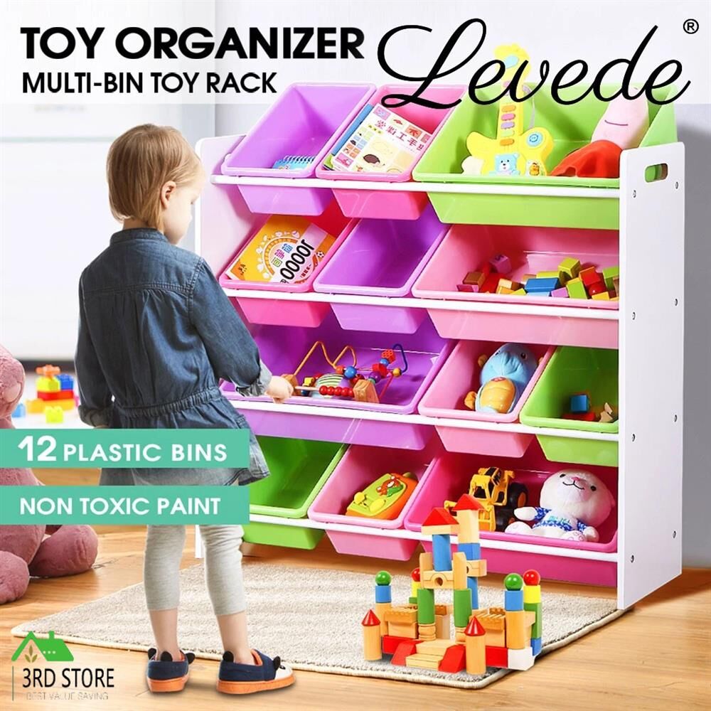 RETURNs Levede 4 Tier Wooden Kids Children Toy Organizer Bookshelf with 12 Plastic Bins