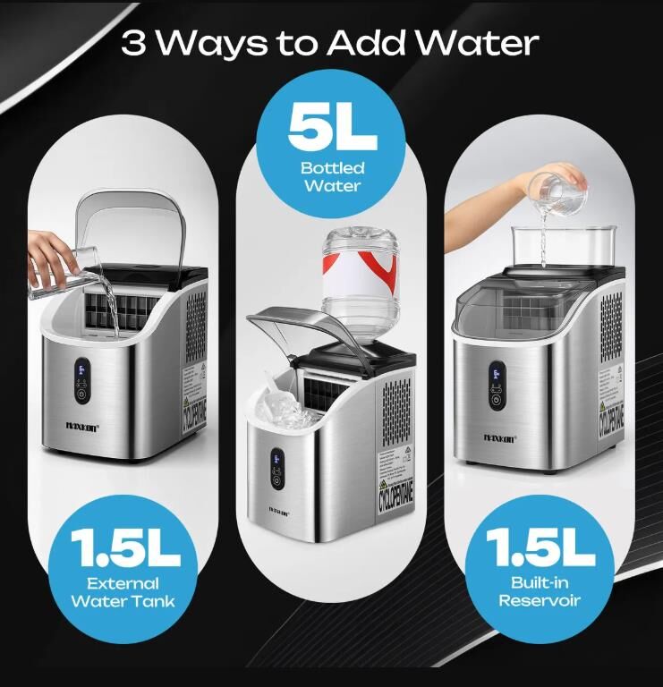 - 3 Ways to Add Water & 6.5L Tank: The countertop ice maker holds up to 6.5L, reducing refills, and offers three convenient ways to add water to suit your setup.