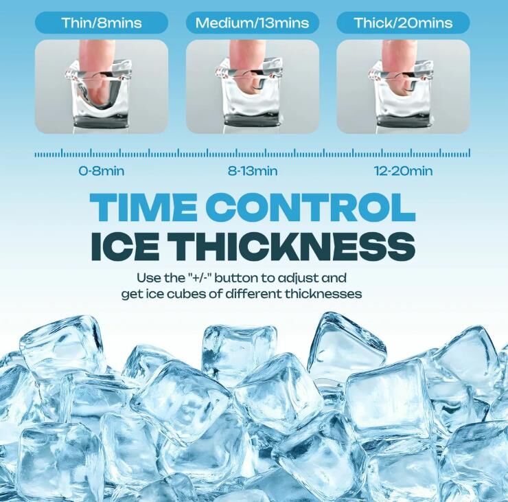 - Adjustable Ice Thickness: Customise cube size by adjusting the ice-making time-increase or decrease the duration to get thicker or thinner ice as needed.