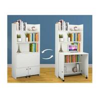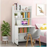 The bookshelf is integrated with the desk, under which there are 2 wheels