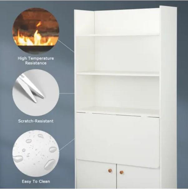 This modern computer desk will be your optimal choice if you want to have an organised and multifunctional work or study environment. The streamlined design pairs with a chic white finish, making it easy to blend with contemporary and traditional interior alike. The solid wooden frame boasts a foldable desktop, three-tier storage shelf and two-door cabinet. You'll have roomy space to stow your textbooks, magazines and other essentials. By folding the desk downward, it can be easily transformed into a freestanding cabinet.