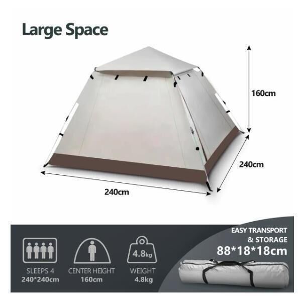 Perfect for any outdoor camping trip, this instant pop-up tent is the ultimate accompaniment to tackle exciting adventures and experiences. Its ultra-high-quality silver coating on polyester and oxford cloth makes them waterproof to 3000 mm and provides strong UV protection. To maximise protection against inclement weather, the rainfly and inner tent seams are securely PU-taped. Double entry doors incorporate two large windows and a top screened window, ensuring unexceptional comfort, ventilation, airflow, and extra privacy. An overall size of 240cmx240cmx160cm offers room for up to four campers. The superb fast-pitch design, paired with an easy pack-down solution and lightweight yet strong materials, enables you to spend more time relaxing and enjoying your family or solo holiday.