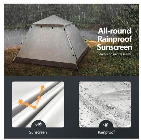 - All-around protection: 210T silver-coated polyester and Oxford cloth ground sheets provide 3000mm of water resistance and excellent UV resistance. Doors equipped with high-quality zippers can be closed tightly. The PU waterproof tape for both the rainfly seam and the inner tent seam provides stronger resistance to harsh weather.