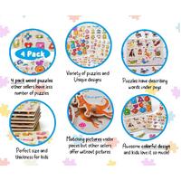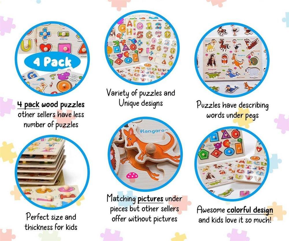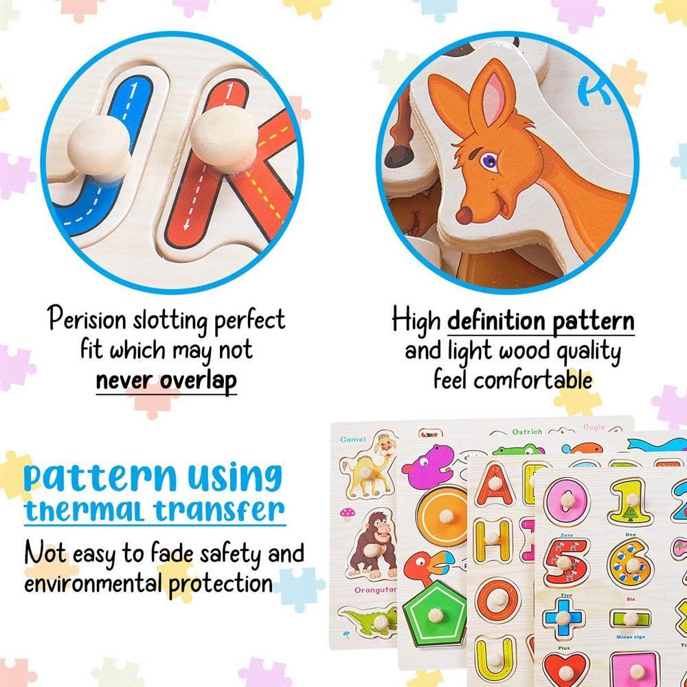 - The puzzles include 26 x ABC alphabet pieces WITHOUT PICTURES on the back board, 11 x see-inside animals pieces, 11-x see-inside vehicles pieces and 20 x numbers pieces.