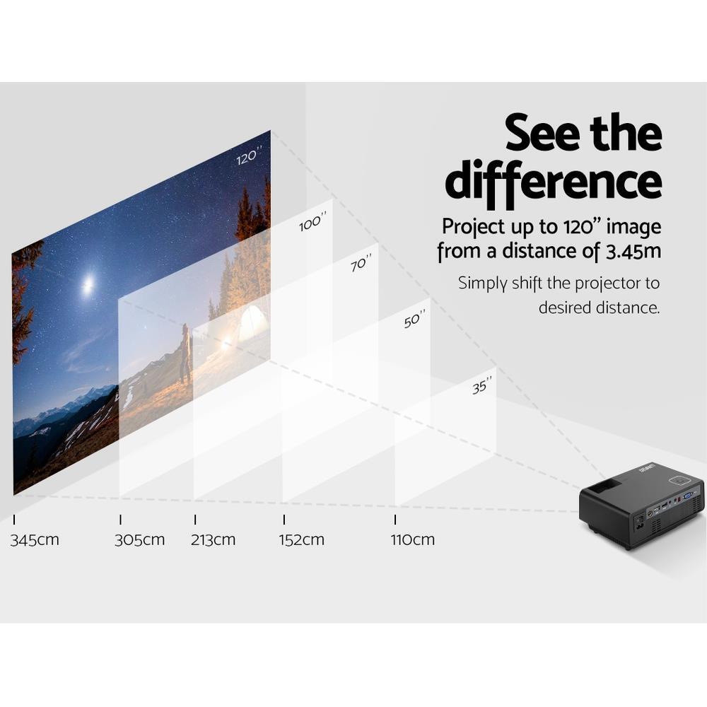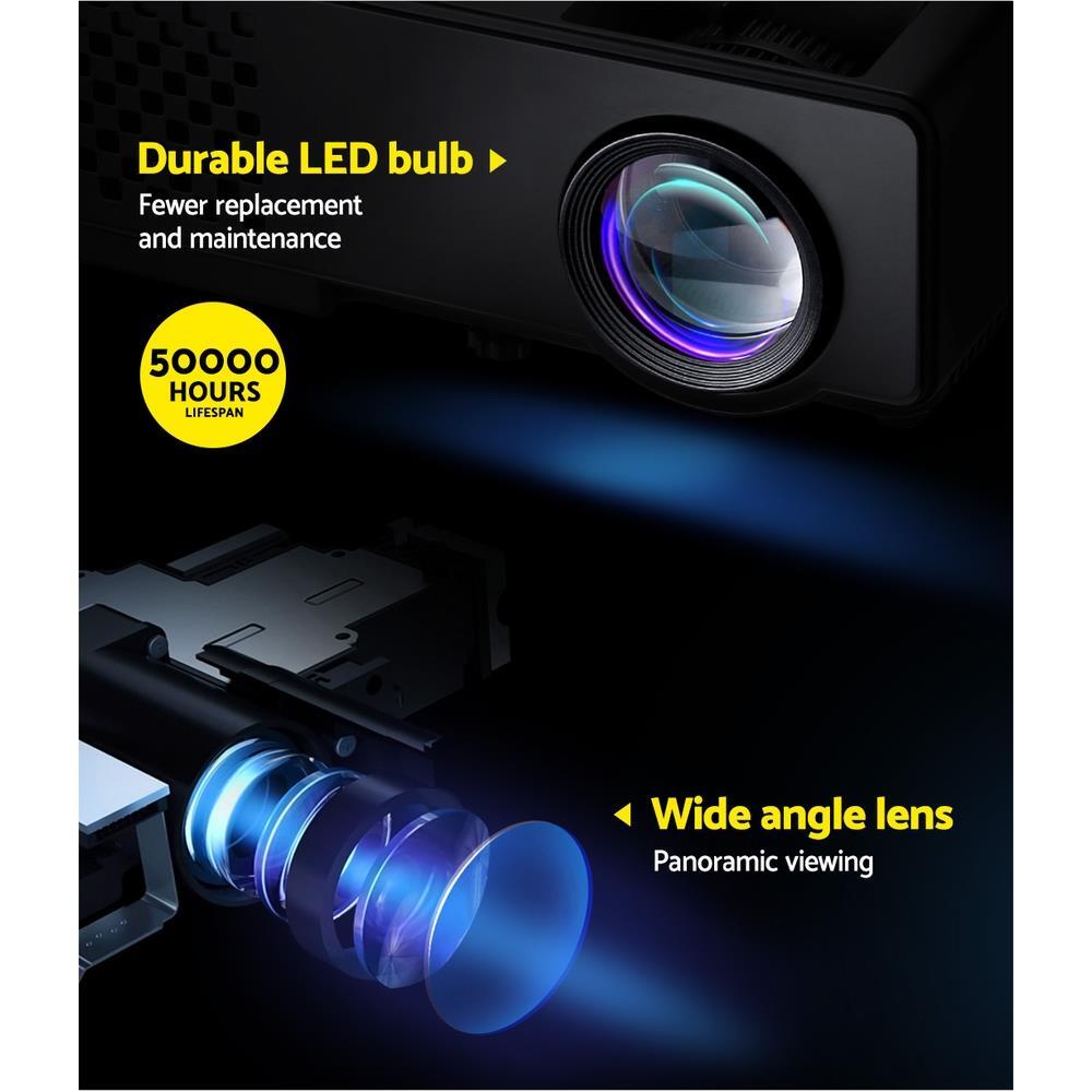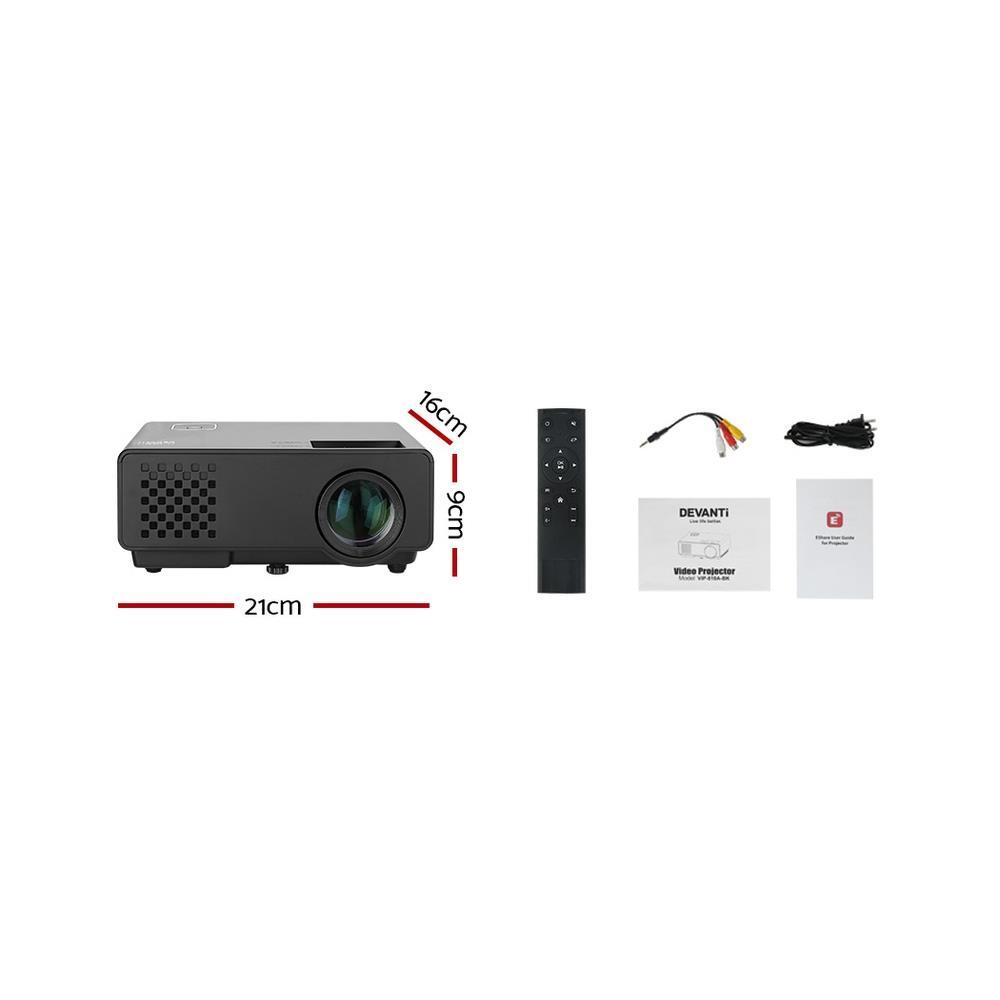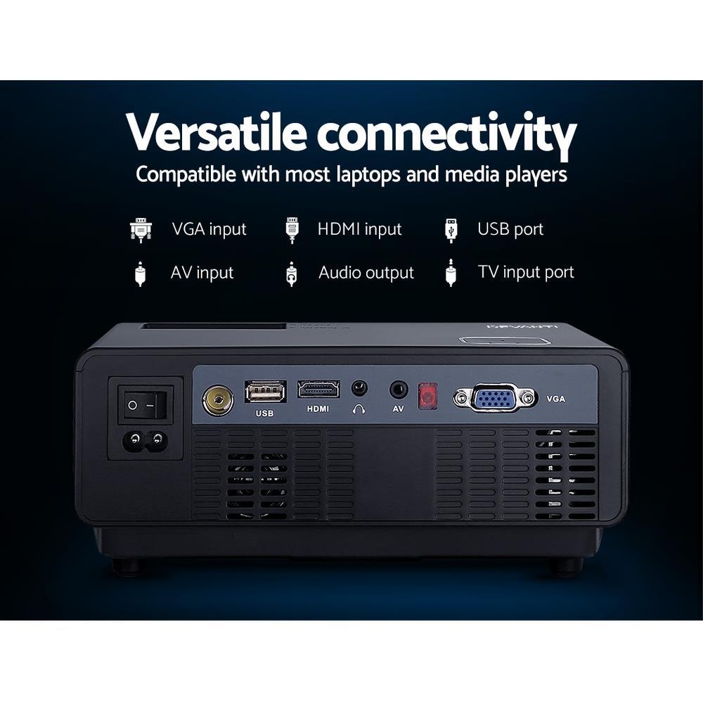 Enjoy epic entertainment with our Devanti Video Projector. From your small screen to the big screen, our video projector effortlessly supports screen cast from your iPhone, iPad, smartphone, tablet, laptop and stream contents to the projector screen without any need of a dongle, adaptor or cables. And with its ultra-expansive colour gamut, the projector delivers crisp clear images with more brilliant colours and is fully HD 1080P compatible. It also features a built-in heavy bass speaker and a 1000 lumens lamp with a long lifespan of up to 50,000 hours. Best of all, you get a wide screen experience from a relatively short projection distance. In fact, you can adjust the screen size from 35 inches up to a massive 120 inches. Not least, you have HDMI, USB, VGA, AV and 3.5mm audio ports for fast connection to multiple devices such as external speakers, game consoles and hard disks. A remote control and bonus 3-in-1 AV cable are also included.