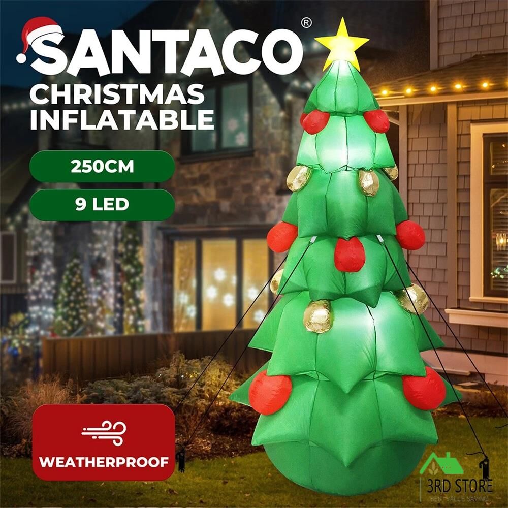 Celebrate the magic of Christmas with the Santaco 250CM Inflatable Christmas Tree! This tall and beautifully illuminated blow up tree is the perfect way to bring festive cheer to your front yard, backyard, garden, or indoor space. Designed for both day and night display, it features 9 built-in LED lights and a glowing star treetop that radiates warm, joyful light. Whether you're hosting a holiday party or creating a cozy atmosphere at home, this inflatable Christmas tree is a captivating centerpiece that delights kids and adults alike.