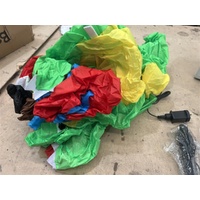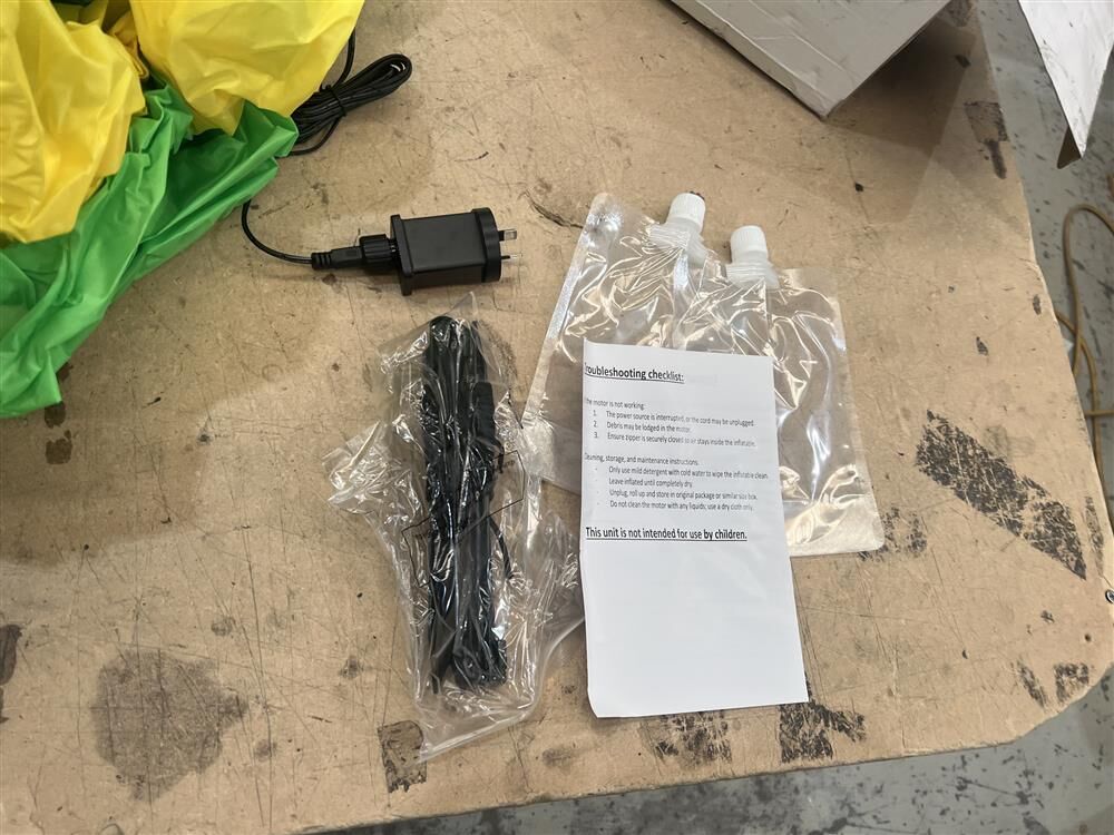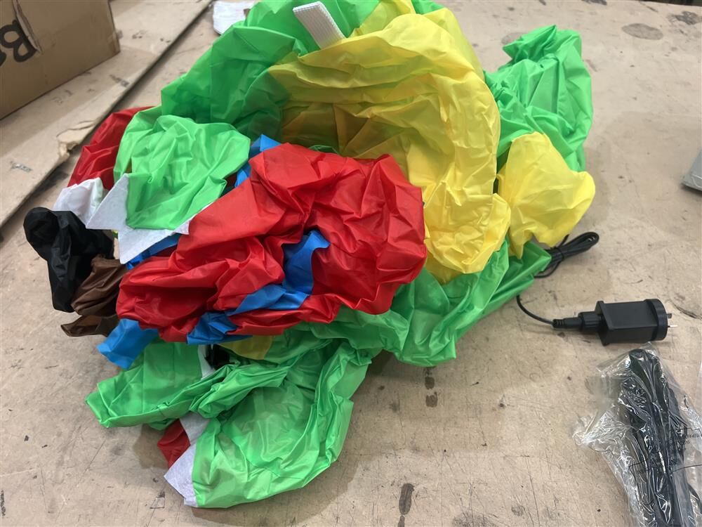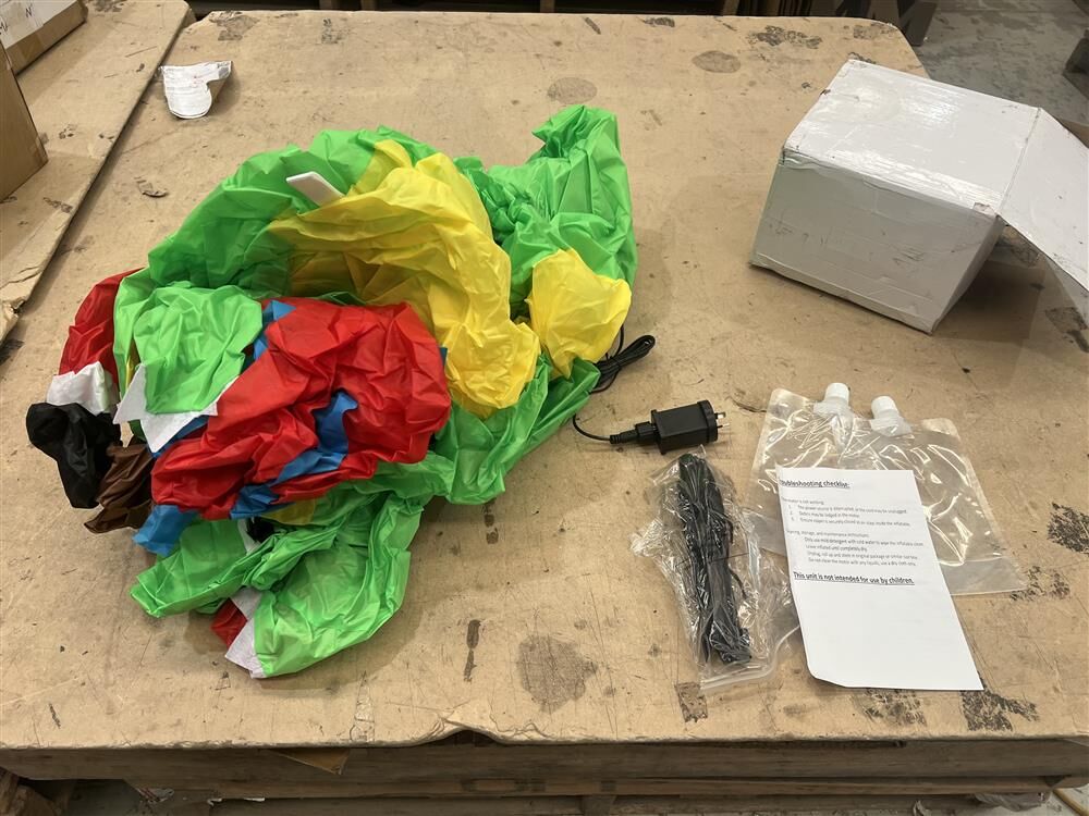 The base is stabilized with water bags to prevent tipping, while an internal fan facilitates quick inflation for a realistic appearance.