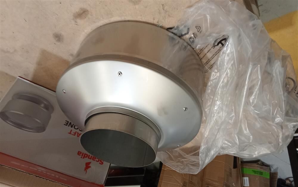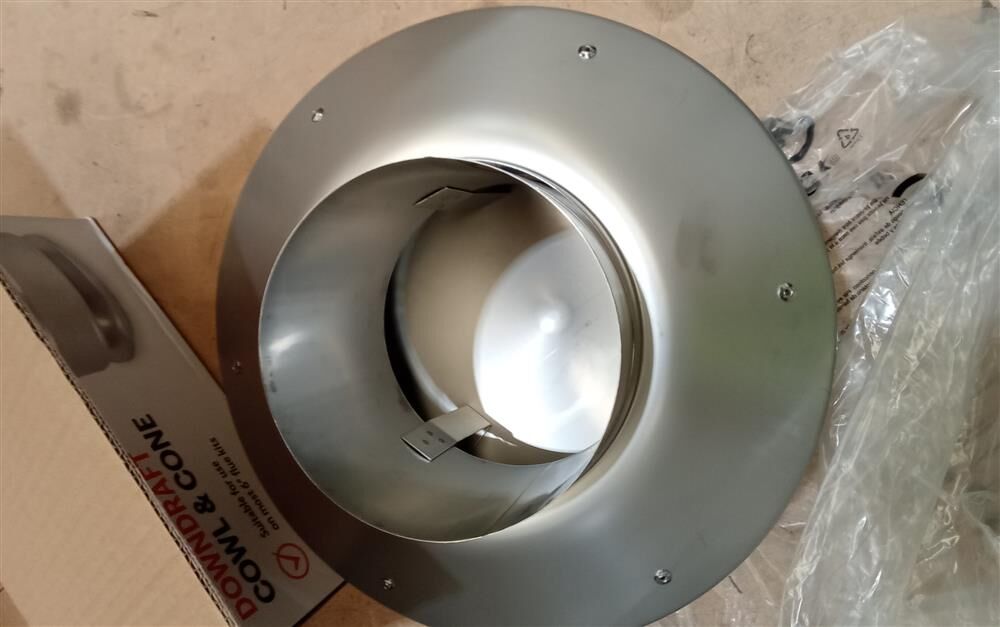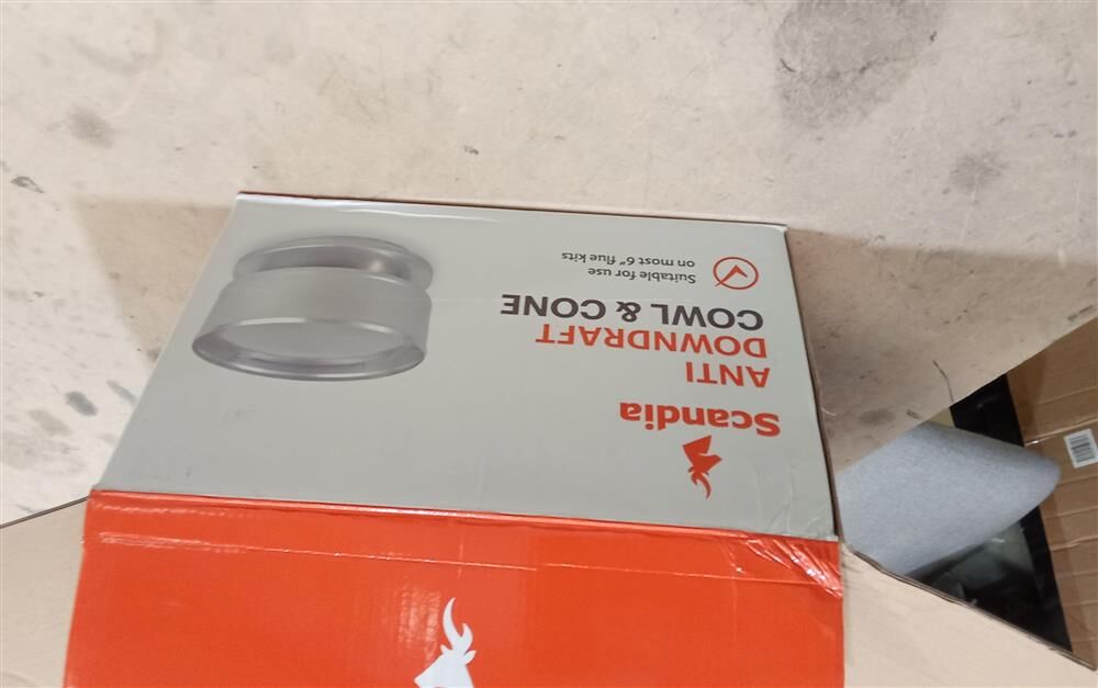 This product includes a 6" Stainless Steel Anti-Down Draft Cowl and 6"-10" Cover Cone. It is suitable for use with the Scandia 4m default flue kit.
