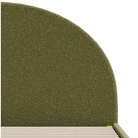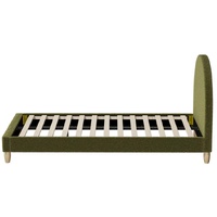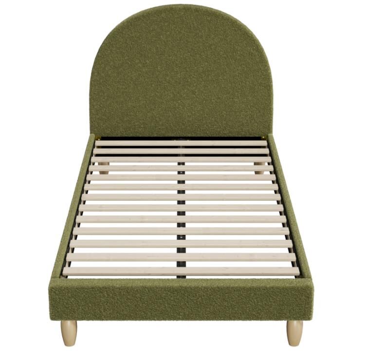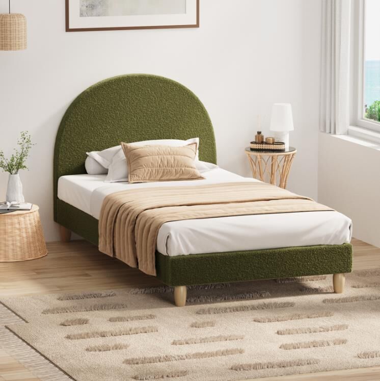 - Materials: pine wood frame, 100% polyester bouclé upholstery, high-density foam padding, plywood slats, rubberwood legs