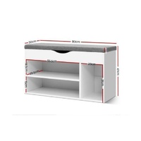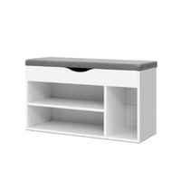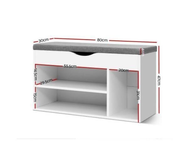 Get yourself a Shoe Cabinet Bench which blends two functions into one elegant piece. \n \nMade of eco-friendly particle board, our shoe cabinet bench has ample space to store up to nine pairs of footwear. \n \nDress shoes, sneakers, boots, heels and sandals are all welcomed to own their spot in the two open shelves and side compartment. \n \nThere is also a closed storage compartment hidden under the seat, with a cut-out handle for easy opening. \n \nn addition to shoe storage, the shoe cabinet bench also offers a soft and comfortable rest with its 4cm thick cushioned seat. \n \nBest of all, its thoughtful design means that you can place it in your hallway or entrance for a neat and tidy look that blends \n \nseamlessly with your home decor. So remove the clutter and get organised with our shoe cabinet bench. \n \nWe are sure it will feet right in with your discerning taste for all things stylish and chic. \n \nNote: Please refer to dimensions photo for the fitted shoe sizes. Buyers may have to bear the cost for returning/exchanging the item if not suitable. \n \nFeatures \nStylish and contemporary design \nEco-friendly material \nFabric bench \nDurable and practical \nSturdy construction \nEasy to clean \nEasy to assemble \nStores up to 9 pairs of shoes \n \nSpecifications: \nBrand: Laila's Creations \nMaterial: Particle board \nThickness: 15mm \nSeat weight capacity: 100kg \nSeat cushion thickness: 4cm \nOverall dimensions: 80cm x 30cm x 45cm \nColour: White \nAssembly required: Yes \nNumber of packages: 1 \n \nPackage Content \n1 x Laila's Creation shoe Cabinet Bench \n1 x Assembly Manual
