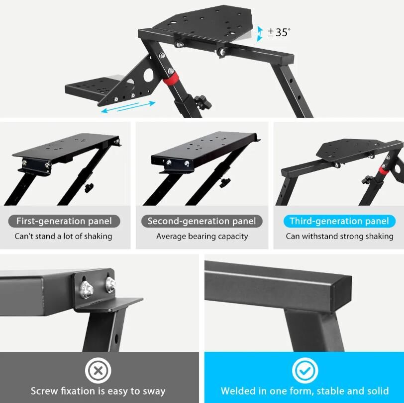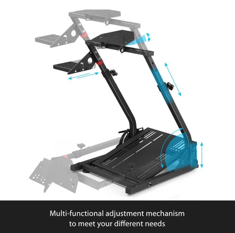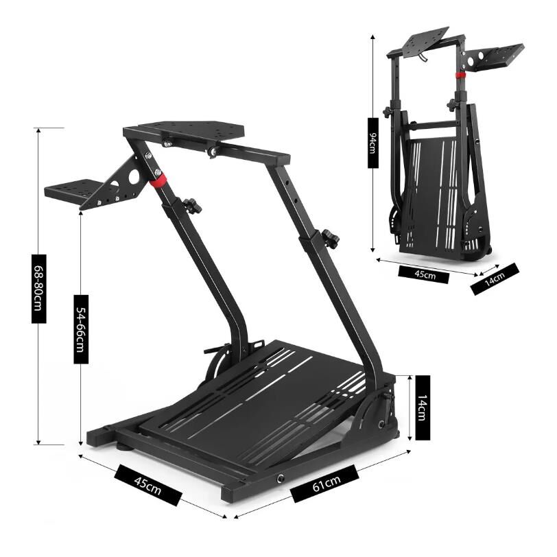 Not having a lot of space but longing for taking great pleasure in a simulated racing game? This foldable racing simulator wheel stand is perfect for you! Compared with other racing stands, our gaming wheel stand is characterized by an updated pedal platform, which allows the pedal to be installed on its right side and supports a 5-level adjustment. Moreover, the pedal platform is at a realistic angle of inclination, which enables the pedal to move closer to or away from you and thus gives you a more realistic racing experience. The fully adjustable height of the steering wheel allows the user to adjust to their stature for a comfortable position. Besides, this racing wheel stand comes with a foldable design, making it easy to store. The main body of the steering wheel stand is made of stainless steel, and the surface is coated with black plastic powder, contributing to its durability for continual use.