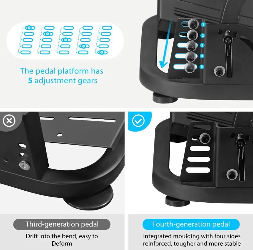- Various Adjustable Positions: The updated pedal platform allows the pedal to be installed on its right side, and it is adjustable in five-level heights. Moreover, the pedal platform is at a realistic angle of inclination, allowing the pedal to move closer to or away from you. The shift lever position is perfect and realistic.