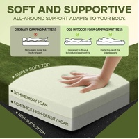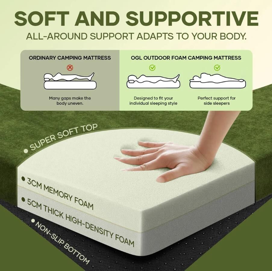 - Soft & Supportive: Features a 3cm memory foam layer over a 5cm supportive base, adapting to your body shape for enhanced comfort and shock absorption. Ideal for a superior camping sleep experience compared to sleeping bags or air mattresses.