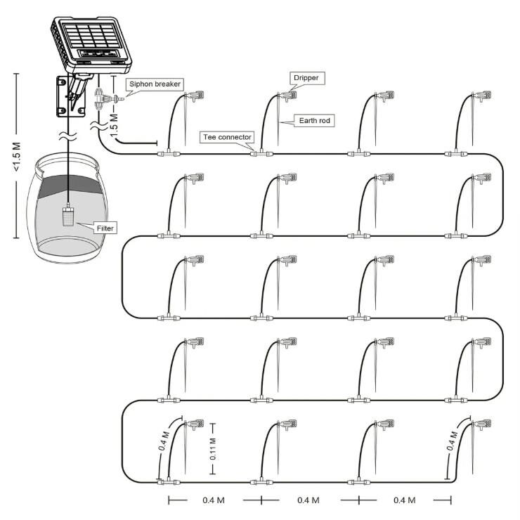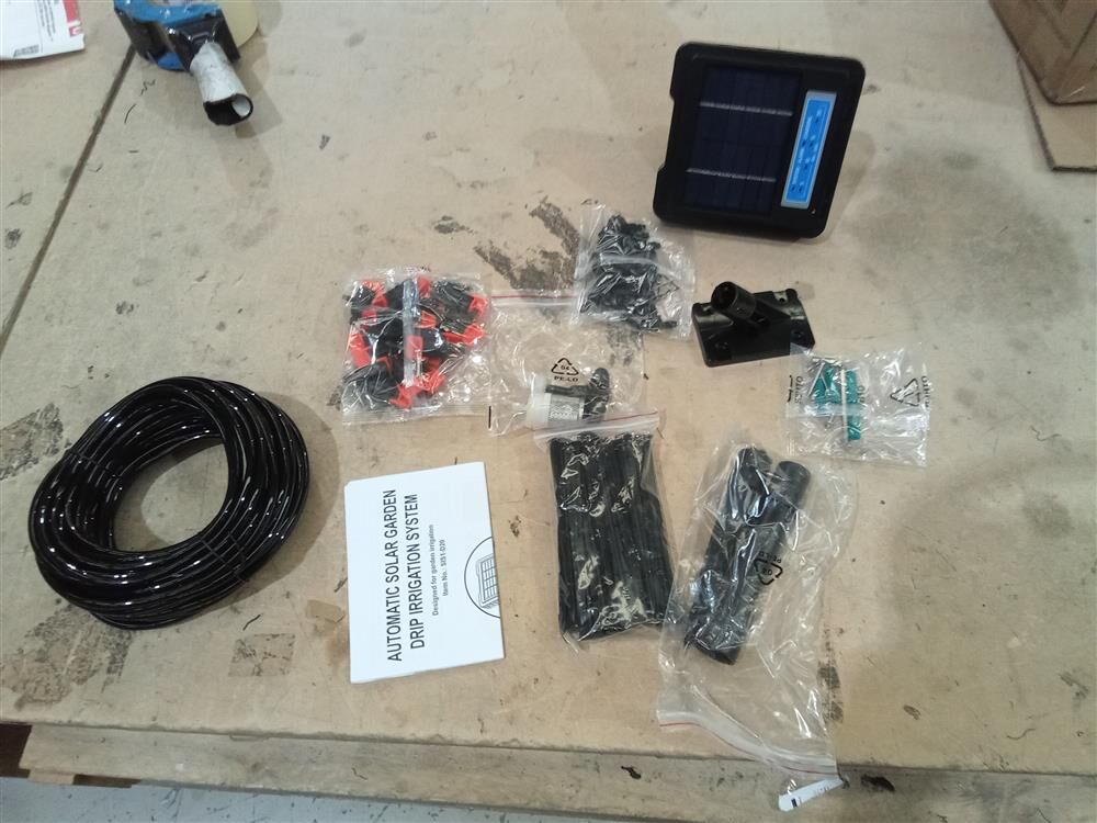 1 x Solar Irrigation Unit 1 x Filter 1 x Syphon Breaker 1 x Ground Spike 1 x Water Hose (Ø4mm/20m) 1 x Wall Bracket 1 x Allen Wrench 1 x Installation Pieces Set 20 x Drippers (2L/H, adjustable) 20 x 10cm Earth Rods 20 x Tee Connectors (Ø4mm) |