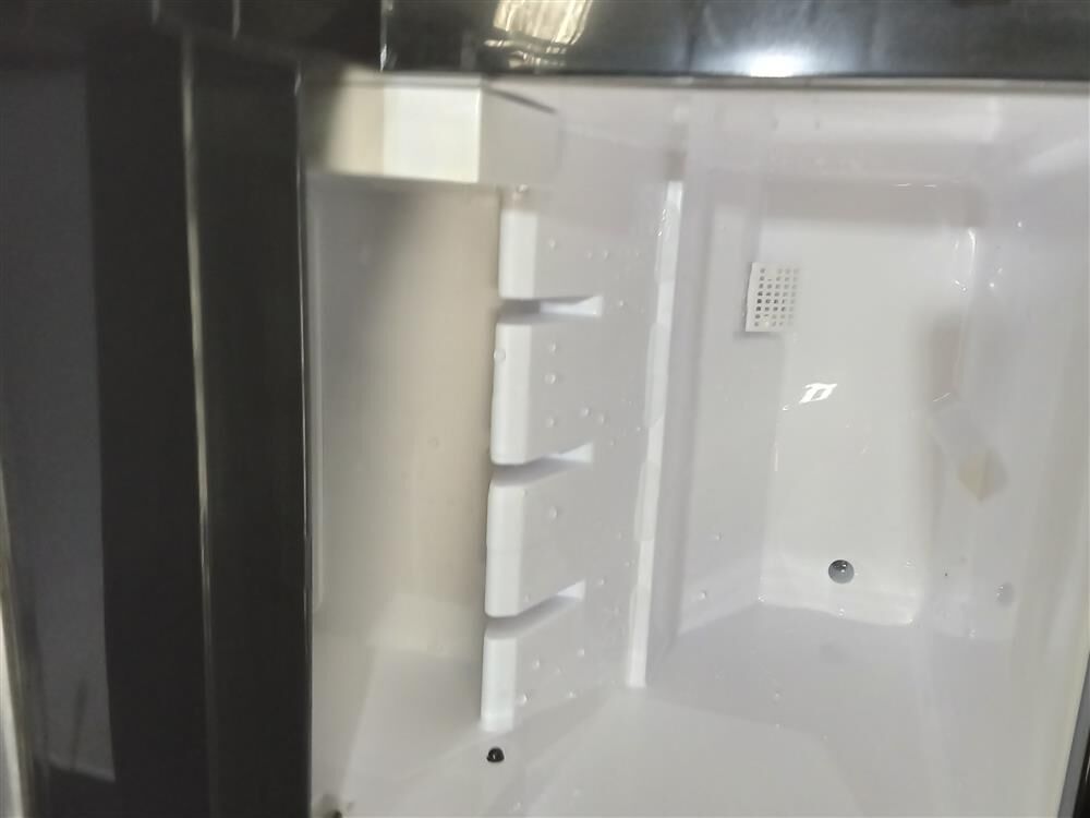 No drain line. No plumbed water to your ice machine. If you want to drain your ice maker, just pull open the plug. Maybe do that outside or over our sink.