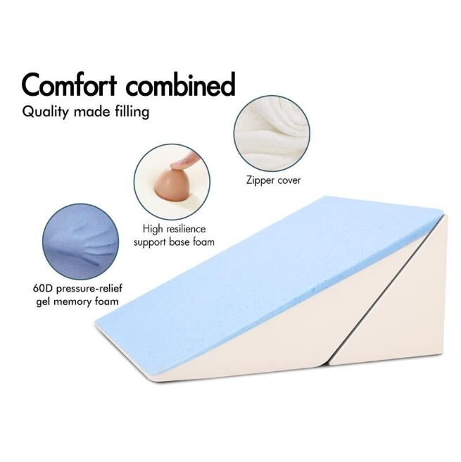 * Ideal for stomach sleeper, side sleeper, back sleeper* Great gift for pregnant woman, office lady, couch potato and bed lingerer* A necessity for those who need upper body elevation due to acid reflux, sinus pressure, blocked nose or snoring* Support for upper body, waist & back, leg, knee, joints, etc* Removable small wedge for different combinations and adjustments* Multiple uses don't limit your creativity* Play around with the smaller wedge pillow for your customized position* Good for bed and sofa use* 60kg/m3 cool gel memory foam surface* High-density resilient base foam* Antibacterial and anti-mites* OEKO-Tex certified fabric and removable zippered cover* Improves circulation and relieves pressure points* In-house testing for durability - pressing 50,000 times* In-house testing for durability - trundling 50,000 times