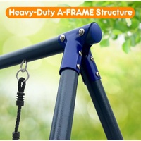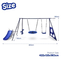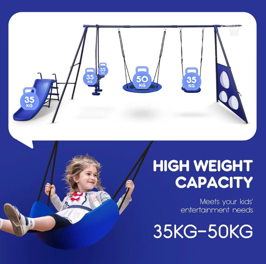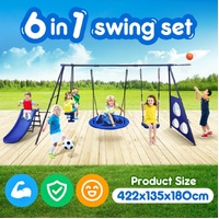 Turn your backyard into a fun world for your kids with this 6-in-1 swing set that is suitable for kids aged from 3 to 12. It comes with a saucer swing and an individual swing, a slide, a seesaw, a basketball hoop, and three football gates, offering endless fun to your children. Built with an A-style frame, this swing set with a slide ensures stability and safety so that you know your children enjoy themselves with peace of mind. Made of powder-coated metal steel, our swing set is rust-resistant, which requires low maintenance and ensures durability for long-term use. This children's swing set is so multifunctional and durable that your backyard is sure to ring with happy laughter once you anchor it there.