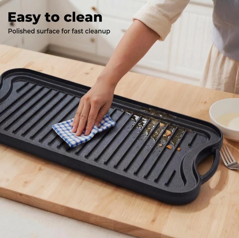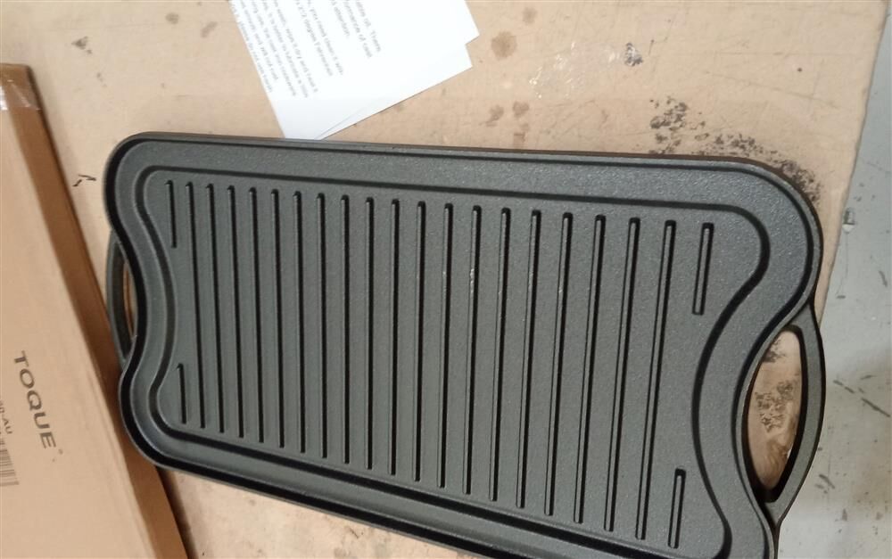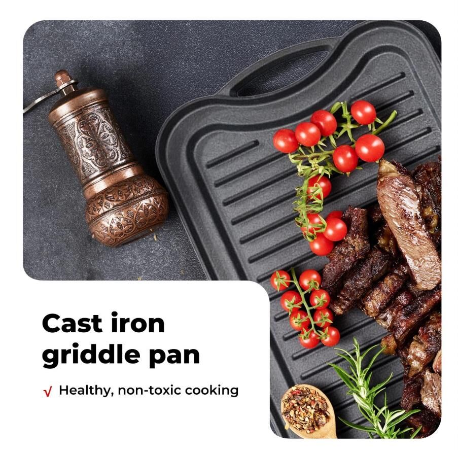 Experience versatile cooking with the Toque cast iron frying pan, crafted from heavy-duty cast iron and pre-seasoned with 100% plant oil for a natural non-stick surface. This reversible cast iron griddle features a smooth side for eggs and pancakes and a grooved side for grilling meats and vegetables, making it a perfect cast iron skillet, grill pan, or large cast iron pan.