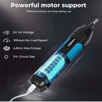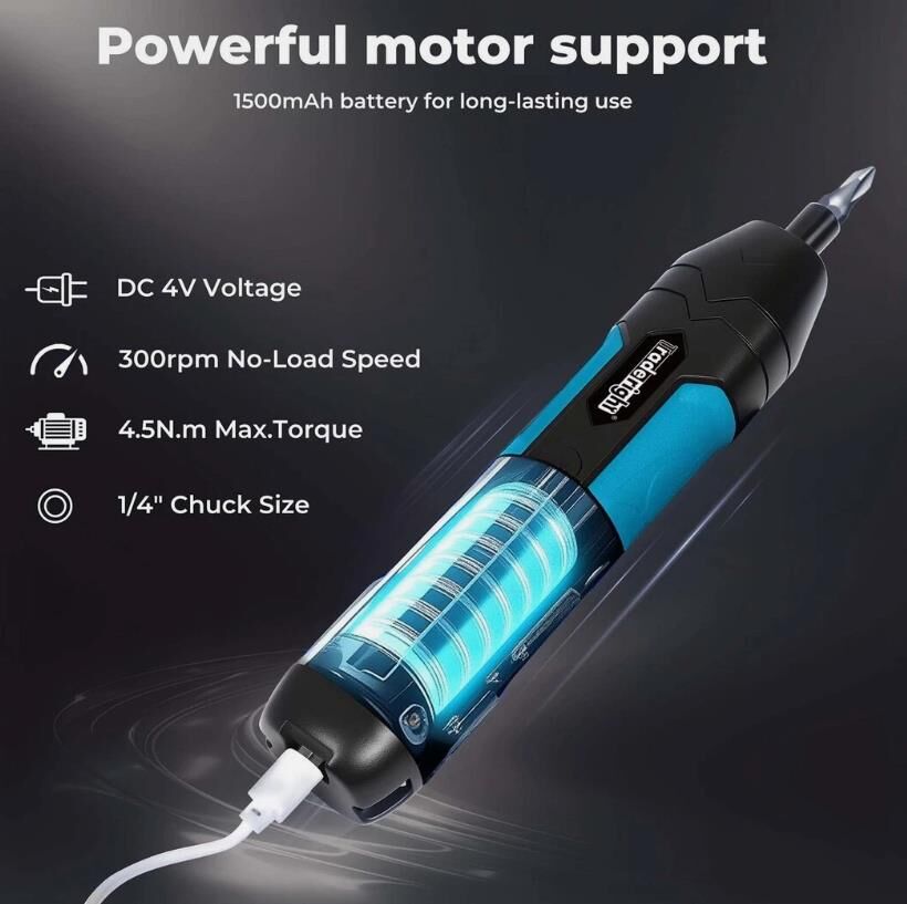 This compact and powerful 4V electric screwdriver is the perfect tool for everyday DIY projects and light assembly tasks.Powered by a 1500mAh rechargeable battery,it provides ample power for driving screws and fastening tasks around the home or workshop.The screwdriver offers 4-level torque, making it suitable for a wide variety of materials while ensuring you can handle both soft and hard screws with ease.Its ergonomic design adjusts for comfort during extended use,reducing hand strain and enhancing overall control.Equipped with a 1/4"chuckthe screwdriver is compatible with most standard bits,allowing you to quickly swap out bits to meet your specific needs.Whether you're tightening screws,assembling furniture,or handling light household repairs.