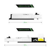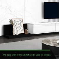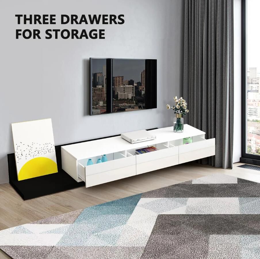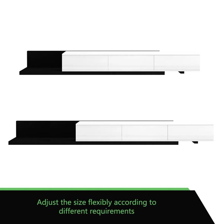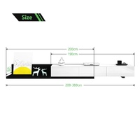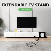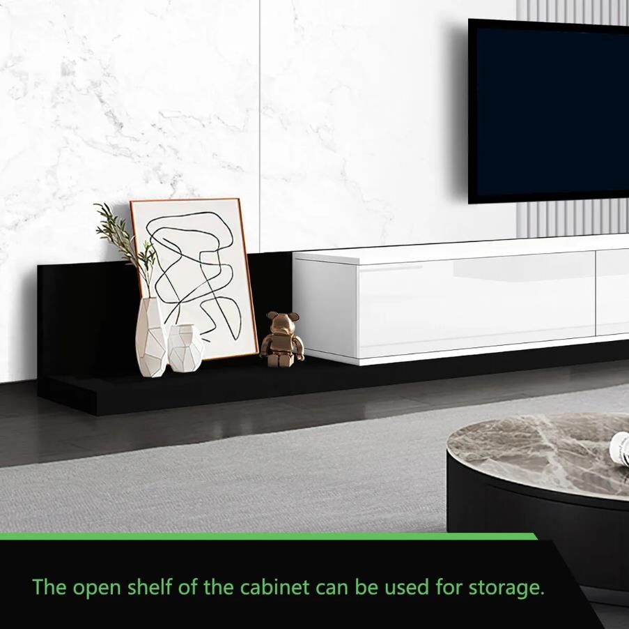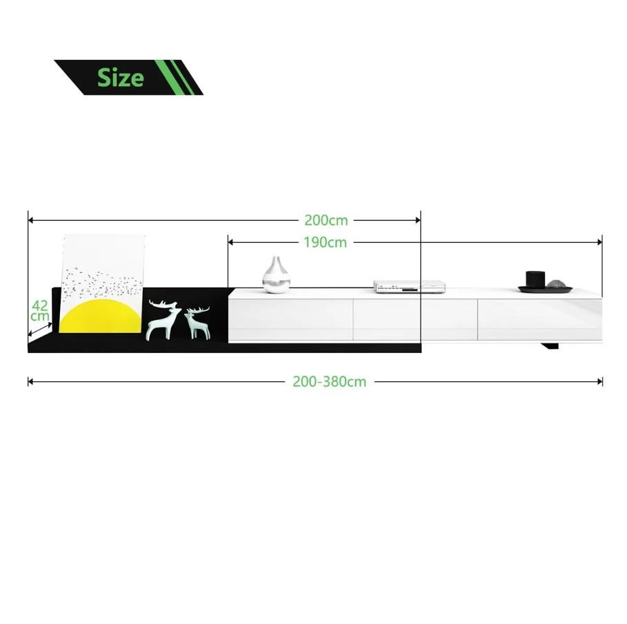 Reduce clutter and accommodate your media equipment by using this TV Stand Unit Cabinet. Made of high-quality particleboard, the entertainment unit is sturdy and durable to last for years. Extendable from 200 cm to 380 cm, our entertainment unit is designed to suit rooms of any size. Its 4 cm thick black frame section can be arranged on the left or right side according to your needs. Furthermore, there are three large drawers and an open storage shelf for your remote controls, CD players, magazines, etc. Meanwhile, its drawers are designed with rebound devices for smooth pulling and easy access to your items. Packed with a high gloss front and an elegant look, this TV cabinet shows modernity and complements your home decor. It is suitable for many occasions, such as living rooms, video rooms, and conference rooms.