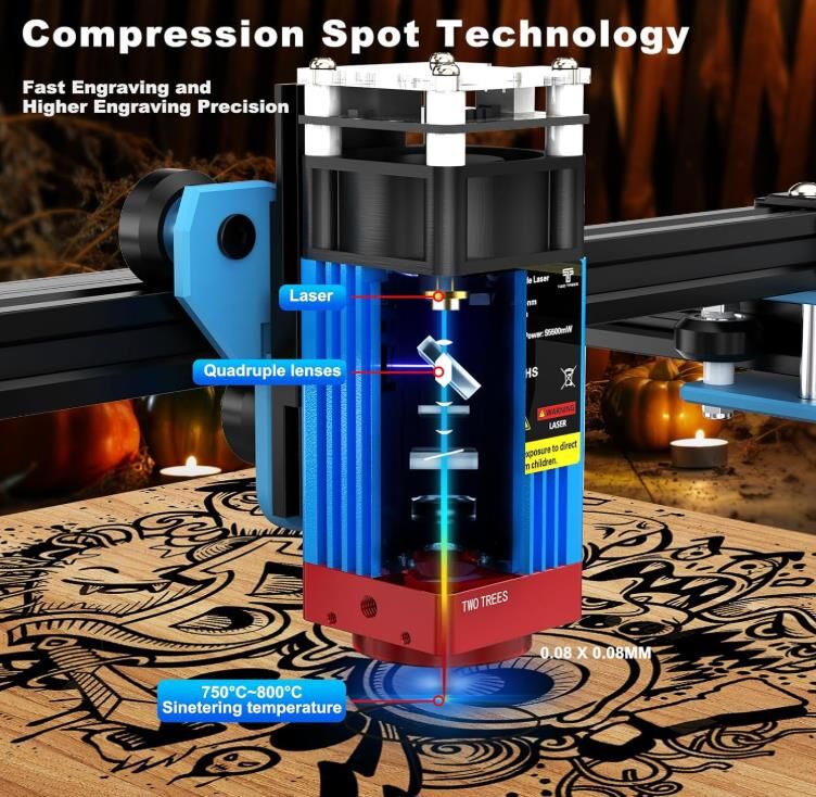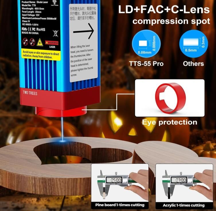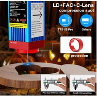 Advanced Laser Technology: TTS-55 Pro laser module uses the latest LD+FAC+C-Lens compression spot technology, fixed focus, focal length is only 23mm, compared with other long focus lasers, short focus laser has stronger engraving and cutting ability. Engraving accuracy: 0.1mm. Laser power: 5500mW, machine output power: 40W.