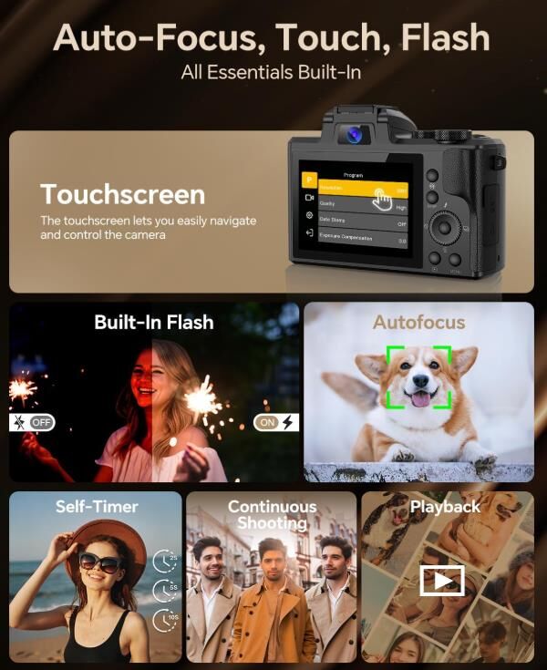 - 【Built-In Flash & Expandable Features】Shoot like a pro in any lighting. Shoot in low light with the flash, or attach external flashes/mics via the hot shoe for pro-level setups. This video camera supports timer mode, burst shooting, instant playback, and doubles as a webcam(plug-and-play via USB-C). Whether filming YouTube tutorials, live events, or low-light portraits, it's a versatile cameras for photography tool for pros and hobbyists alike