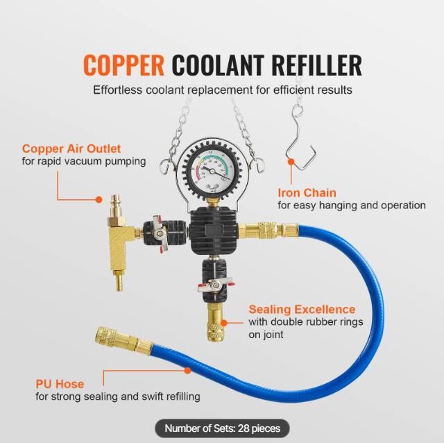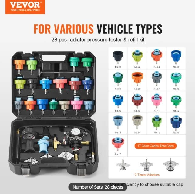 - High Compatibility: Our 28-piece radiator coolant pressure tester and refill kit is designed for maximum compatibility, featuring 17 color-coded test caps and 3 test covers. Identifying the right adapter for your vehicle has never been easier. This coolant pressure tester kit is your go-to solution for a wide range of Japanese, European, and American car models.