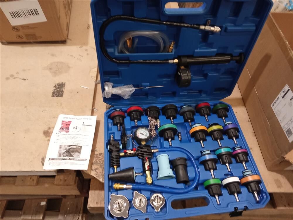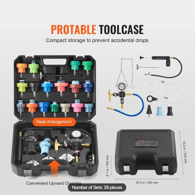 - Compact and Organized: The toolbox of our 28pcs radiator pressure tester is compact and portable. The interior features precise slots to keep accessories neatly organized and prevent them from slipping during transport. Say goodbye to cluttered and messy tool storage.