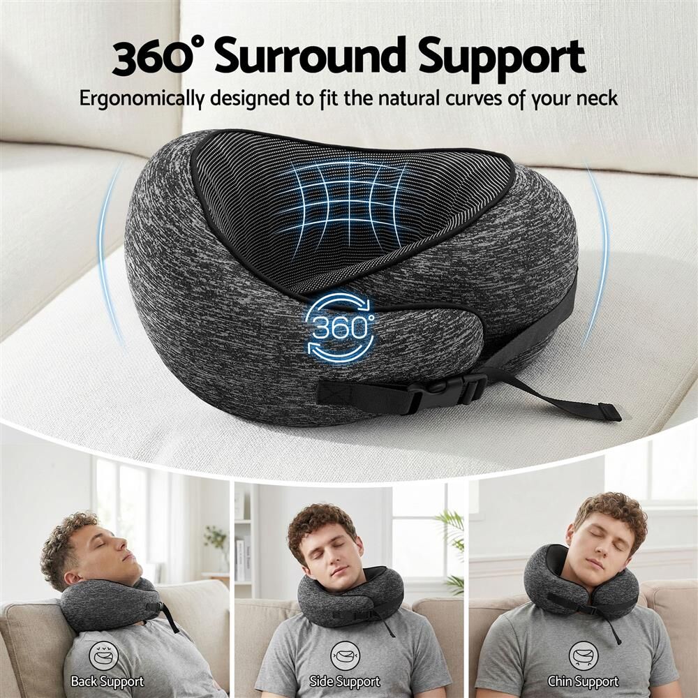 Travel comfortably with our premium travel neck pillow, designed with ergonomic memory foam to support your neck, head, and chin, reducing stiffness and discomfort during flights, road trips, trains, buses, or office naps. The soft, breathable, and skin-friendly cover keeps you cool and comfortable, while the zippered, removable, and washable design ensures hygiene and freshness. With an adjustable buckle strap, this travel pillow provides a secure, personalised fit for all neck sizes and sleeping positions. Compact and lightweight at just 0.37KG, it rolls up easily into the included drawstring bag, making it perfect for planes, cars, trains, or home use.