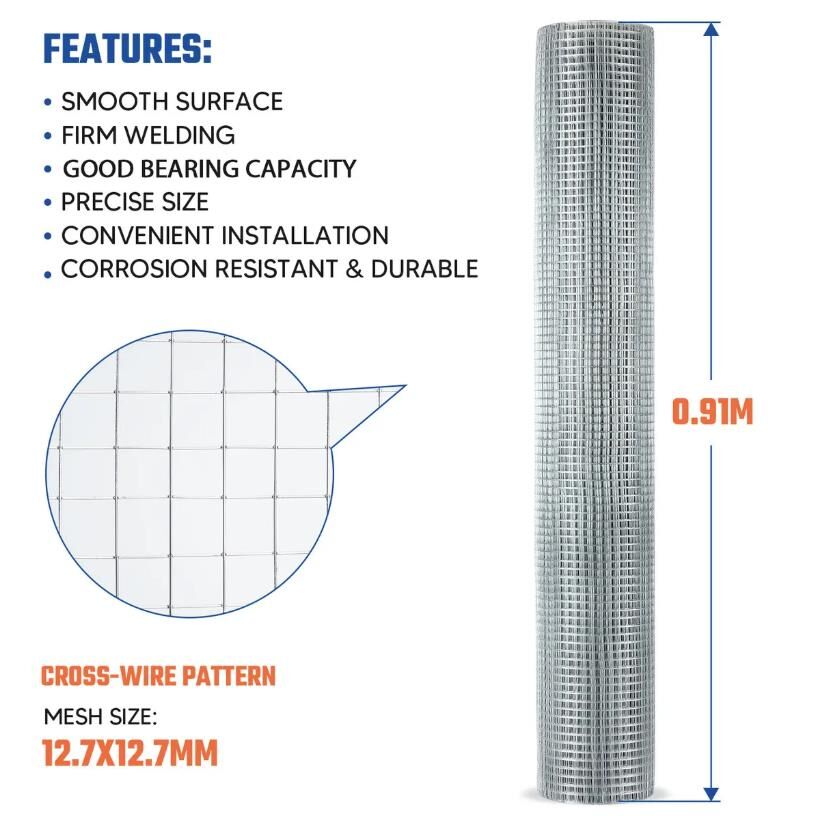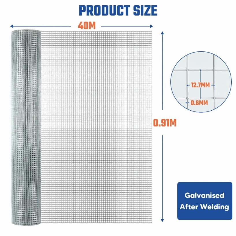 Experience robust protection for your animals, plants, or projects with this welded wire mesh fence. Boasting dimensions of 40m in length and 0.91m in height, our wire mesh roll provides ample coverage for your projects. While its mesh size of 12.7x12.7mm and 0.6mm wire diameter seamlessly integrates security and visibility. Besides, the innovative cross-wire pattern enhances stability and maintains aesthetic appeal. Designed with versatility in mind, this wire fencing roll is ideal for fencing and caging purposes, catering to diverse needs such as chicken coops, plan guards, and custom animal enclosures. Robust and rust-proof, it promises long-lasting performance and minimal maintenance. What sets the wire mesh fence apart is its post-welding hot galvanisation process, which extends the wire fence’s lifespan and enhances its bearing capability to the harshest outdoor conditions.